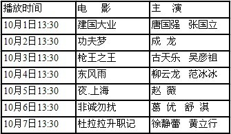 为了庆祝中华人民共和国成立61周年,进一步丰富广大读者的精神文化生活,国庆期间我馆将在二楼集体视听室开展庆祝国庆优秀国语电影展播活动。热忱邀请各位读者到场观看! 具体安排如下: