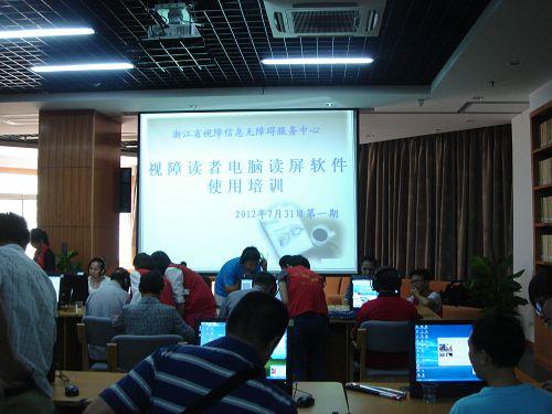 7月31日,浙江图书馆视障中心举行了布莱叶读屏软件使用培训,来自杭州华驰科技有限公司的张楠老师为视障读者介绍了布莱叶读屏软件的基本功能、使用方法、基本操作等。在“玉米社工”志愿者的协助下,视障读者们尝试了文本编辑、浏览互联网、使用即时通讯工具等操作。活动吸引21名视障读者在内的共计约40人参与,整个活动现场忙了不乱,井然有序。