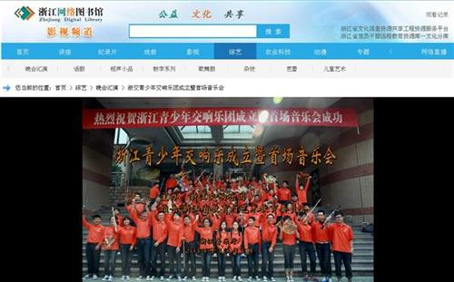 浙江青少年交响乐团成立首演“青春乐动、与你相约”主题音乐会于2014年 10月3日在杭州音乐厅举行。浙江图书馆数字资源中心(共享工程办公室)对音乐会的前期联排以及现场表演进行全程摄录。现在访问浙江网络图书馆视频点播系统,就可以先睹为快。