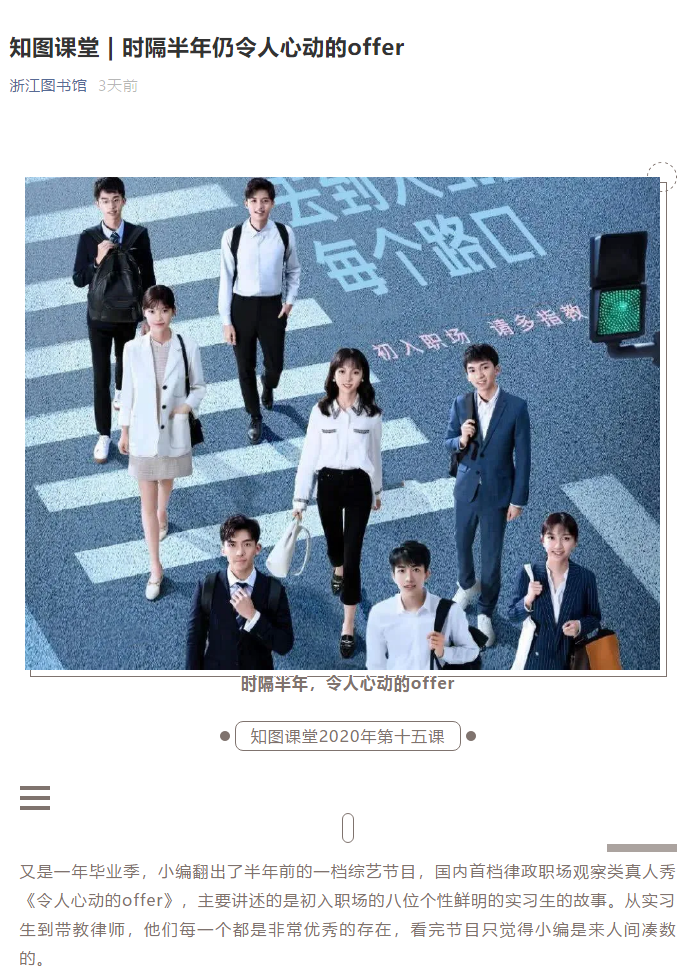8月8日,知图课堂第15讲“时隔半年仍令人心动的offer ”在线上和大家见面了。本期“知图课堂”以毕业季为切入点,结合热门的职场察类真人秀《令人心动的offer》,分享了初入职场需要注意的小心得,同时推荐相关文献5种。