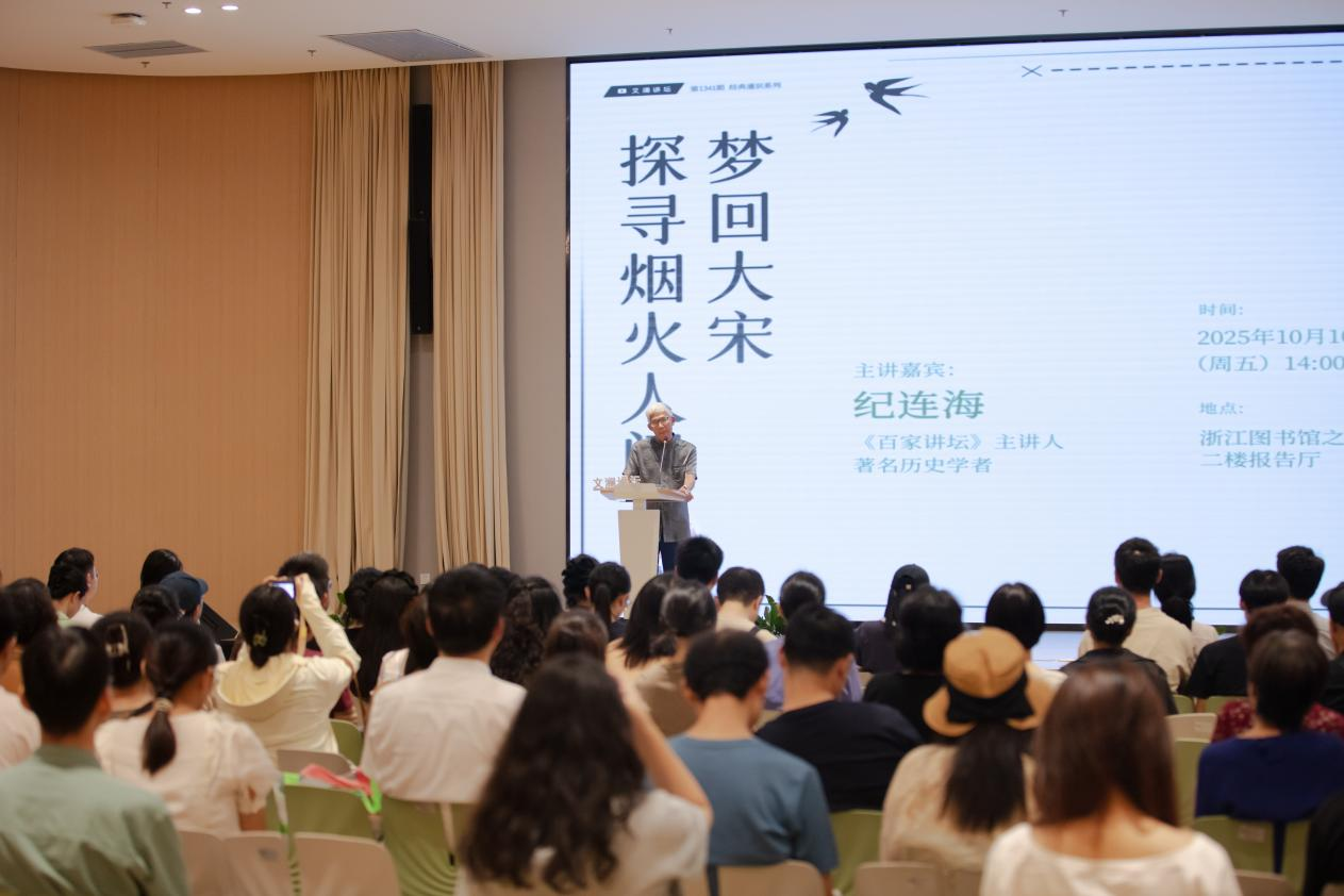 2025年10月10日,著名历史学者、央视《百家讲坛》栏目主讲人纪连海先生受邀做客浙江图书馆,为杭城读者带来了一场题为“梦回大宋,探寻烟火人间”的精彩讲座。纪连海先生以其标志性的幽默与博学,带领全场观众进行了一场穿越千年的宋代城市风情之旅。活动吸引了众多历史文化爱好者参与。