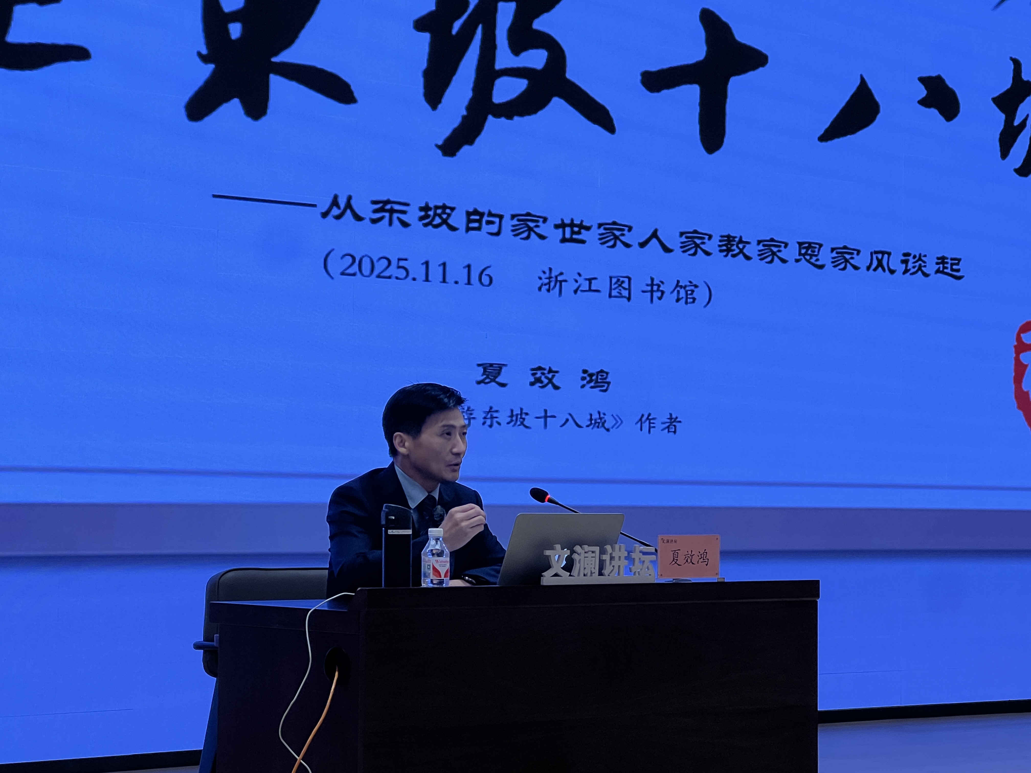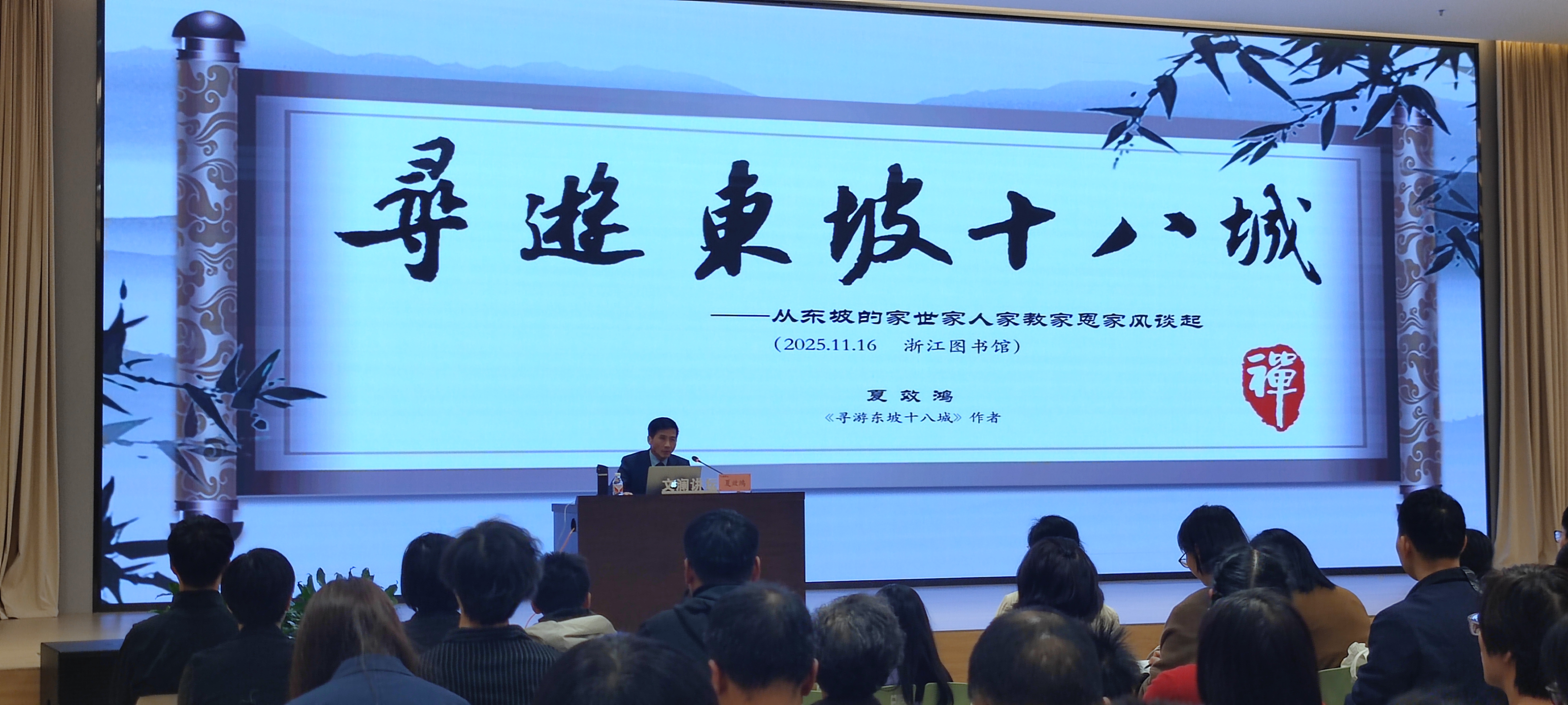 11月16日下午,一场深度文化讲座 “寻游东坡十八城:与东坡同行”在浙江图书馆之江馆二楼报告厅成功举办。杭州市苏东坡研究会副会长、杭州市文学学会副会长夏效鸿通过历时数年、横跨南北的实地寻访,带领现场读者沿苏东坡一生足迹所至的十八座城市,深入探讨了其家世、家人、家教、家恩与家风,为读者揭示了这位文化巨人的生命底色与精神源流。