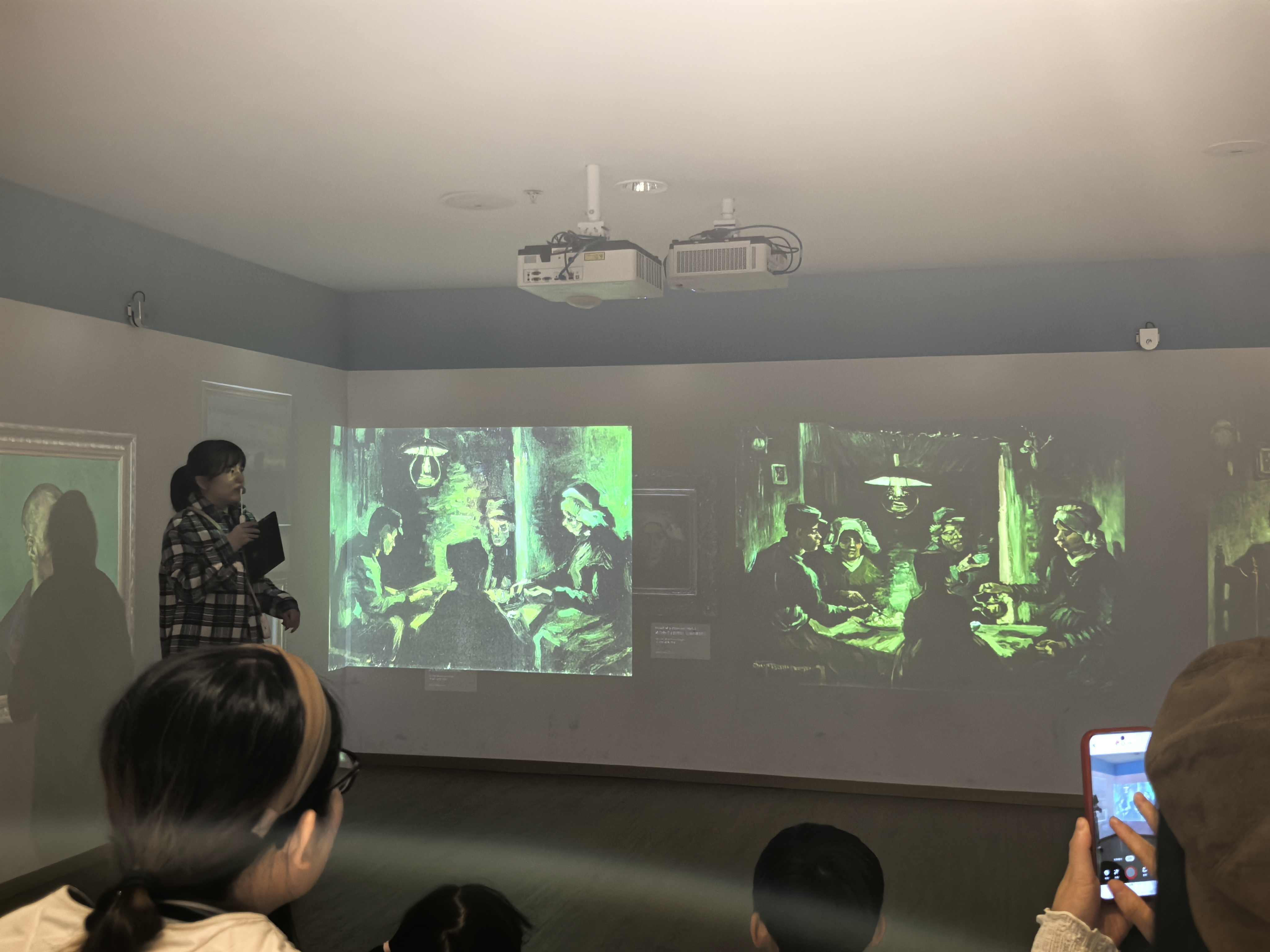 在主讲馆员的生动讲解和全景影像的配合展示下,小读者们完全沉浸在梵高的艺术世界里,发现了不同时期色彩运用的变化——从早期的深沉凝重到晚期的明亮奔放。无论是《星月夜》中漩涡般的星空、《黄房子》里温暖的光影,还是《向日葵》中绽放的生命力,都让小读者们收获了别样的感动。