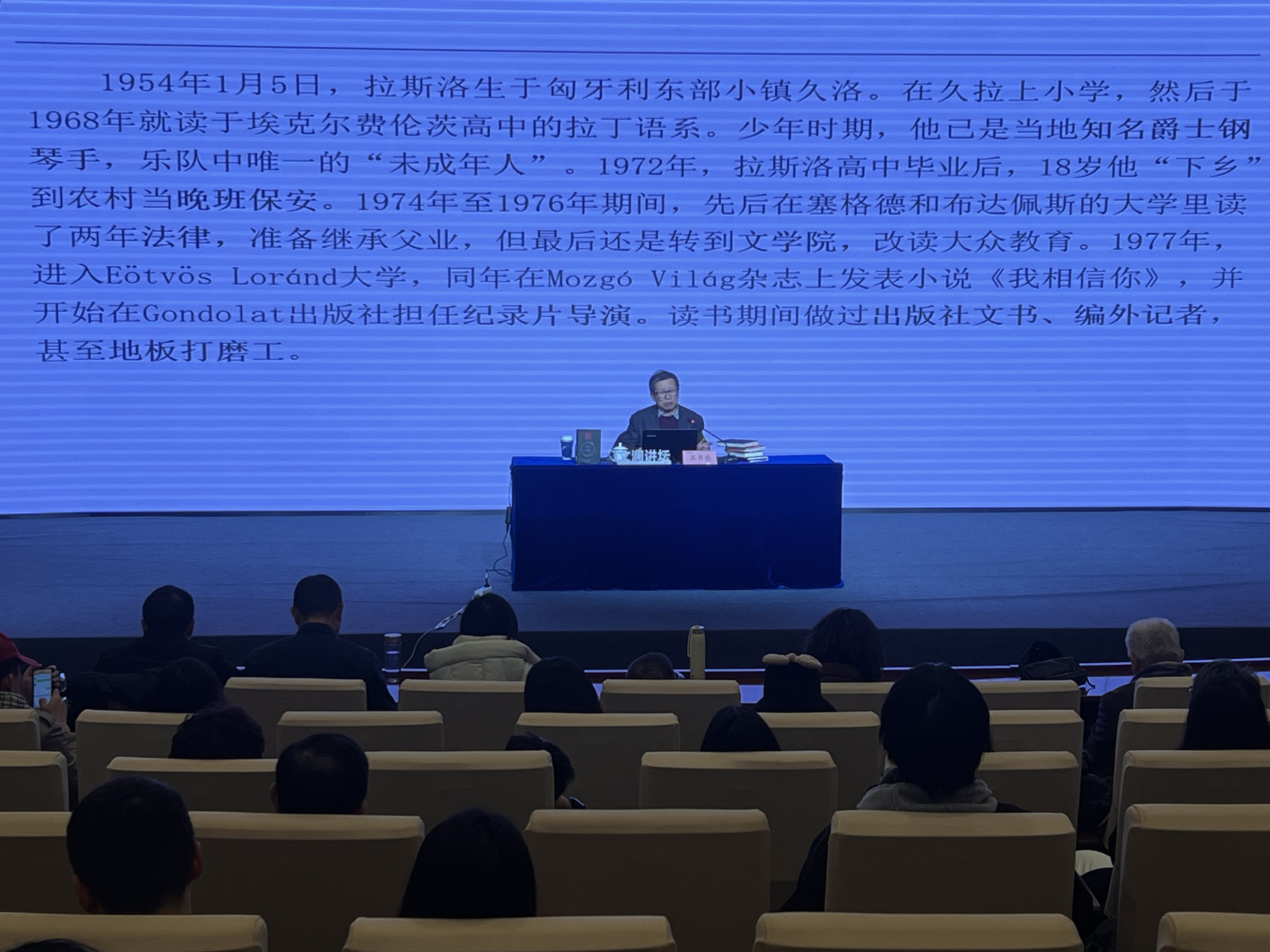 活动伊始,王自亮教授以瑞典文学院的颁奖词为引,指出拉斯洛的创作在当代世界具有的重要精神意义。他强调,这位具备洞察力与悲悯心的小说家,融合了深度现实主义、超现实主义和意识流、荒诞派手法,通过独到的观察力、精湛的表现力与强大穿透力,将人的灵魂置于严酷拷问、现代性寓言的境况中,并承载着“西西弗”反抗荒诞的精神。