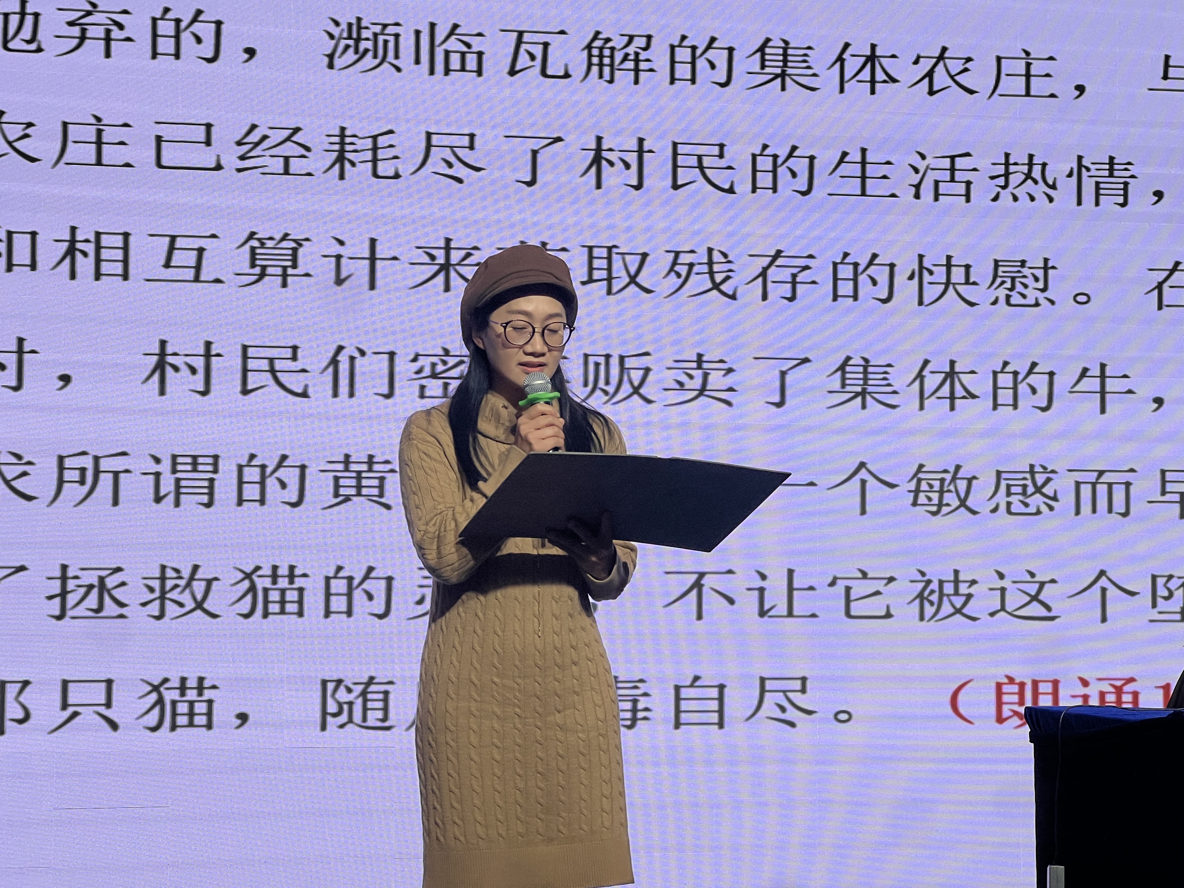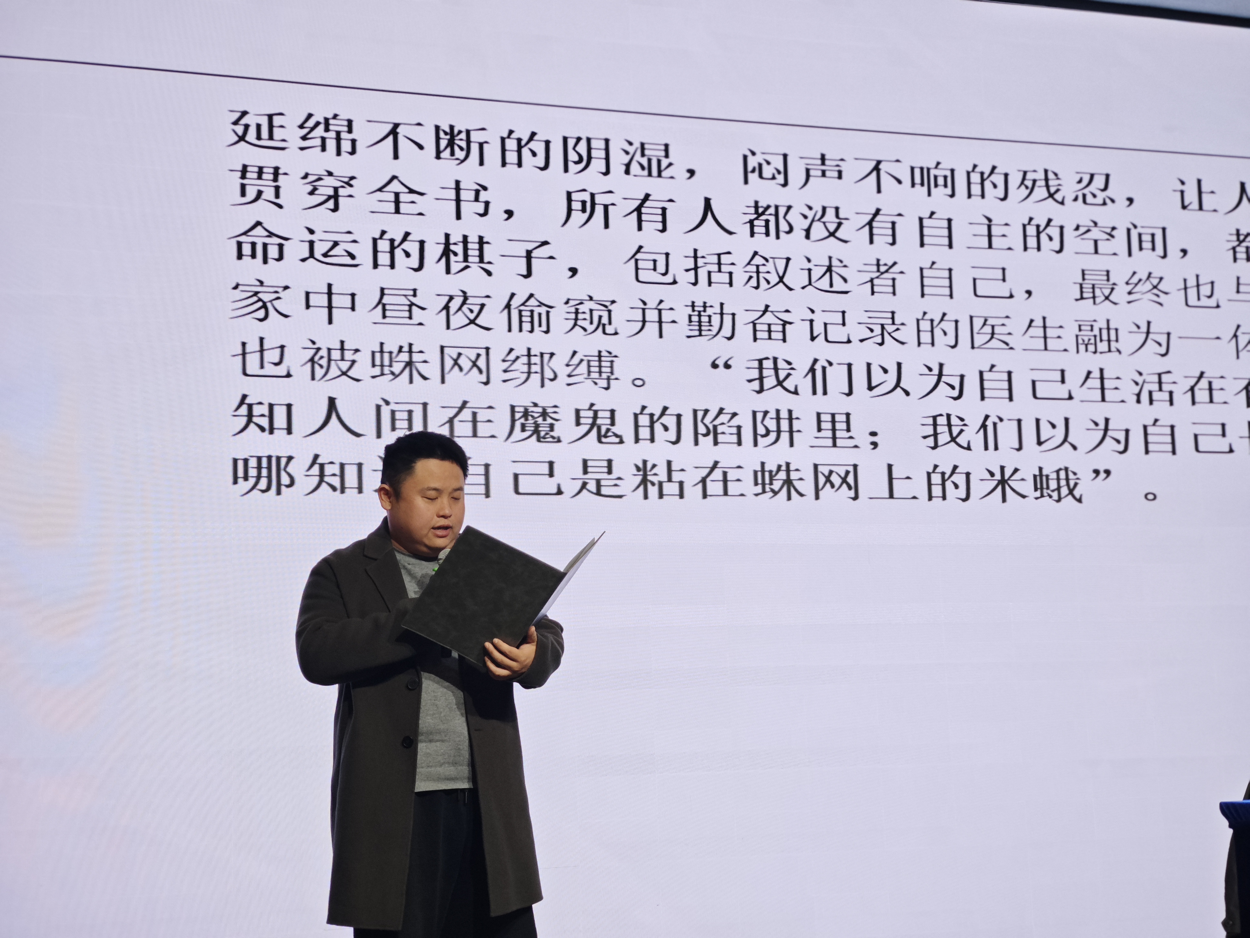 为使读者能更直观地感受拉斯洛语言的魔力与情感的张力,本次讲座特别设置了作品朗诵环节。来自文澜朗诵团的朱旭艳、杨汇、朱妍等三位优秀朗诵者,现场演绎了《撒旦探戈》中的四个经典片段。在深沉而富有表现力的声音中,拉斯洛笔下那连绵不绝、如暴雨倾泻般的长句获得了新的生命。通过声音的演绎,更加直接地撞击着在场每一位听众的心灵,赢得了阵阵热烈的掌声。