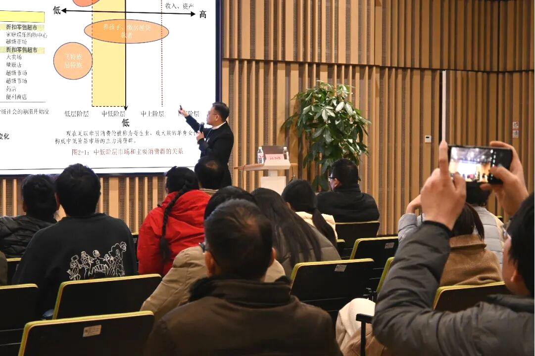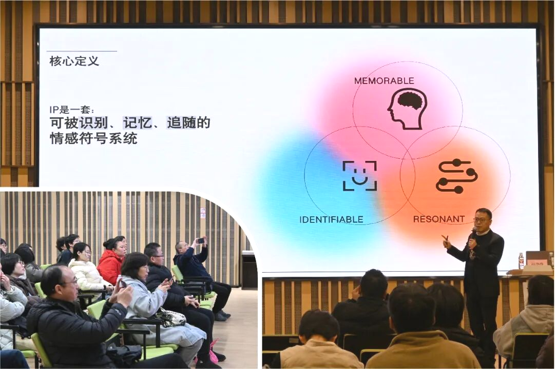 讲座中,赵涤烽老师回溯了从舞台美术到空间设计的跨界生涯,从意大利奥林匹克剧场的透视布景,到乔治·西平、拉尔夫·科尔泰等大师的跨界创新,印证了“空间承载情感,情感赋予灵魂”的永恒命题。他梳理了时代浪潮下与团队的三次跃迁,讲述了从“安居时代”、“乐游时代”到“IP时代”的机遇与挑战,并结合日本M型社会案例的消费趋势分析:当下消费者已从追求 “物质富足” 转向渴望 “精神富足” 。而IP,正是那个可识别、可记忆、可追随的 “心域通行证”,能跨越年龄与文化,构建情感共同体。