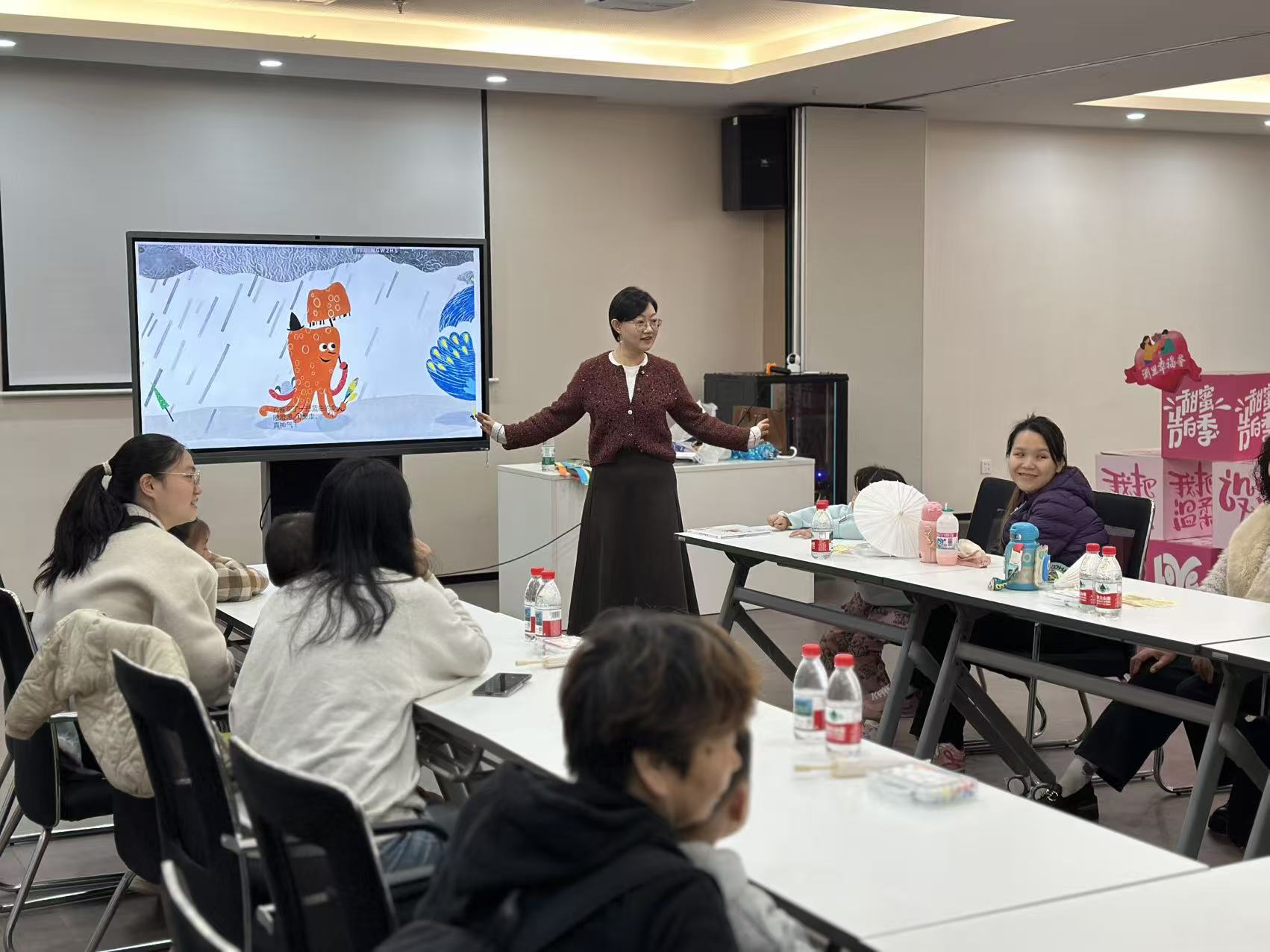 活动伊始,工作人员以生动形象的语言向孩子们讲述了《章鱼先生卖雨伞》的故事。整个故事围绕章鱼先生在雨天为不同动物送上合适雨伞而展开,情节简单却富有童趣与想象力。整个讲读过程中,馆员通过模仿动物声音、展示插图细节等方式,帮助孩子们理解故事内容,认识不同动物的特征与颜色变化。