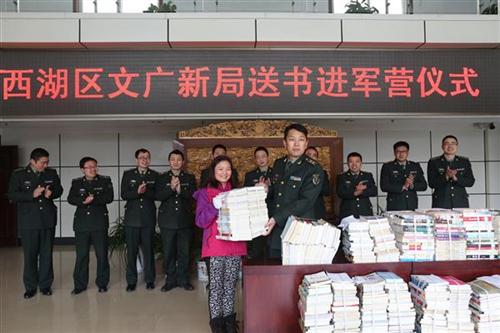与部队开展共建活动,提升军队文化氛围,是西湖区图书馆长期以来坚持的一项重要工作。2014年,西图送了两千册新书至高炮团,一起建设团图书室。西图结合部队实际,紧贴官兵需求,选送的图书涵盖了军事、政治、信息科学、历史、医药等多个类别,深受广大战士的欢迎。这次西图的送书车再次开进军营,又为官兵们带来了一千册图书,丰富了阅览室的馆藏资源。现场的部队领导非常感谢我们对部队的关心、爱护和支持,带领官兵们和我们一起把图书搬下车,并按类别进行整理上架。在书籍交送仪式的现场,官兵和西图工作人员一起合影留念,记录下了浓浓的军民鱼水情。