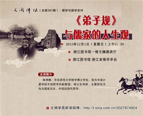 主题:《弟子规》与儒家的人生观 主讲:中国计量学院副教授 林孝瞭 主办:浙江图书馆 浙江省儒学学会 时间:2013年12月1日(星期日)上午9:30 地点:浙江图书馆一楼文澜演讲厅 文澜学苑新浪微博:http://t.sina.com.cn/2027874924