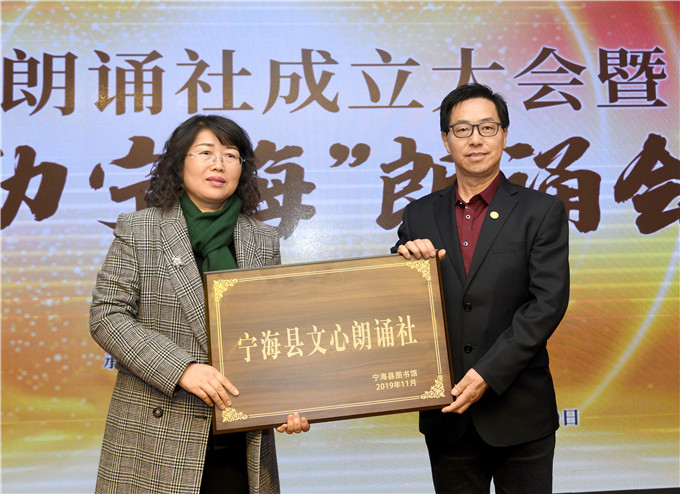 成立大会在诗朗诵《我爱朗诵》中拉开帷幕,宁海县文化和广电旅游体育局副局长金海萍向宁海县图书馆文心朗诵社授牌,会议聘请省朗诵协会会员、宁海县资深节目主持人杨建国为文心朗诵社社长,聘请浙江省普通话测试员李晓萍,宁波市骨干教师、宁海县知名主持人、歌手薛海云为副社长;聘请宁海县音乐家协会主席林启群等14名语言艺术研究实践者担任朗诵指导老师。